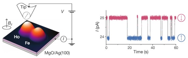 На поверхности оксида магния гольмий испытывает магнитную анизотропию — она приводит к тому, что у атома есть два устойчивых магнитных состояния, определяющихся ориентацией его суммарного спина. Чтобы перейти из одного состояния в другое атом должен преодолеть энергетический барьер. Чем ниже температура среды, тем менее вероятен этот переход. Соответственно этим двум устойчивым состояниям и приписываются значения «нуля» и «единицы».