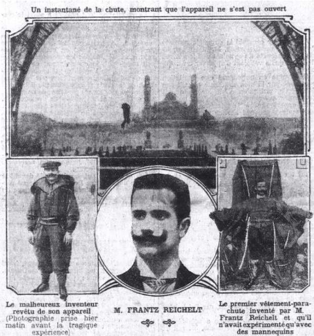 Франц Райхельт (1879 – 1912) был убежден, что может создать костюм, который превращается в парашют для летчиков. В результате он печально прославился, как 'Летающий Портной' после своего рокового прыжка. Француз австрийского происхождения погиб 4 февраля 1912 года, прыгнув с первой платформы Эйфелевой башни в своём костюме. Хотя изначально планировалось использовать манекен, в последний момент изобретатель решился сам опробовать свой «парашют». Его подвела уверенность в том, что изобретение работает