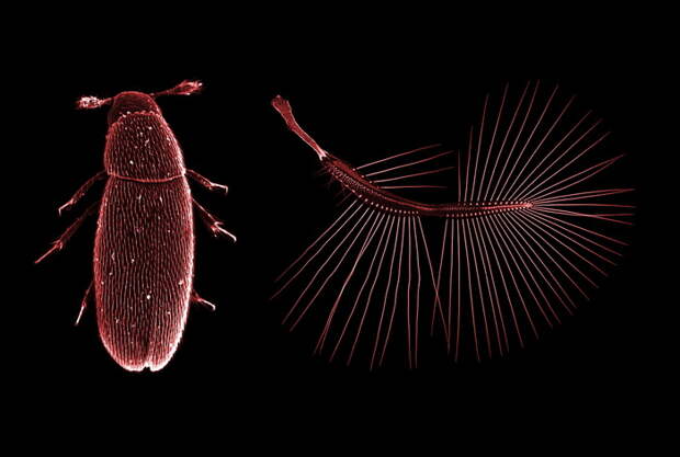 В новой статье в PNAS те же исследователи из МГУ вместе с коллегами из Сколковского института науки и технологий описывают компьютерную модель миниатюризации насекомых, которая показывает, как при общем уменьшении размеров должно было меняться строение крыльев. Результаты, полученные с помощью модели, согласуются с реальными перокрылками разных размеров, взятых в сравнении друг с другом и с обычным двухсантиметровым жуком из семейства Могильщиков. При уменьшении размеров перокрылок изменения в числе щетинок и расстоянии между ними должны были обеспечить оптимальное взаимодействие с воздухом, а изменения в диаметре и длине щетинок должны были обеспечить оптимальную жёсткость крыла. В результате у самых крошечных жуков крылья несут намного меньше щетинок, чем у более крупных перокрылок, но при этом ширина зазоров между щетинками остается при изменениях размеров более или менее постоянной.