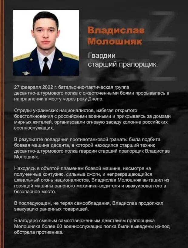 Когда колонну наших войск атаковали силы ВСУ, старший прапорщик Владислав Молошняк, несмотря на ранение, смог вынести из горящей машины своего товарища, а потом вернулся, чтобы помочь эвакуировать остальных. Прочитайте про подвиг этого отважного воина.