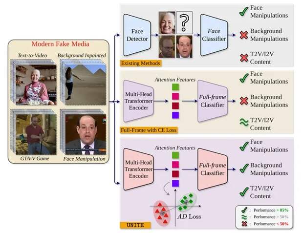 Схема работы: Существующие методы обнаружения дипфейков в основном нацелены на выявление видеороликов, где происходят манипуляции с лицами, и большинство из них не могут делать выводы, если на видео не обнаружено лицо. UNITE эффективно обнаруживает манипуляции с лицом/фоном и полностью синтетический контент.