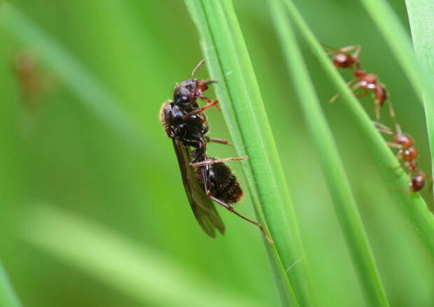 Это очень общее описание того, как устроена жизнь у большинства муравьиных видов. Кроме того, что даже у «среднестатистических» муравьёв есть много нюансов в генетике и поведении членов семьи, среди муравьёв есть такие, которые научились использовать в качестве рабочих другие виды. Некоторые просто похищают чужой расплод, так что рабочие одного вида, превратившись во взрослую особь, обнаруживают себя в гнезде другого вида, где и начинают работать на благо чужого гнезда. А есть такие, у которых королевы спариваются, кроме своих самцов, ещё и с чужими самцами. Из яиц, оплодотворённых самцом своего вида, выходят самцы и будущие королевы того же вида. А вот из яиц, оплодотворённых чужим самцом, выходят гибридные рабочие. В общем-то, это форма паразитизма, только начинается он ещё на стадии половых клеток: королева-матка и её вид паразитирует на сперматозоидах другого вида.