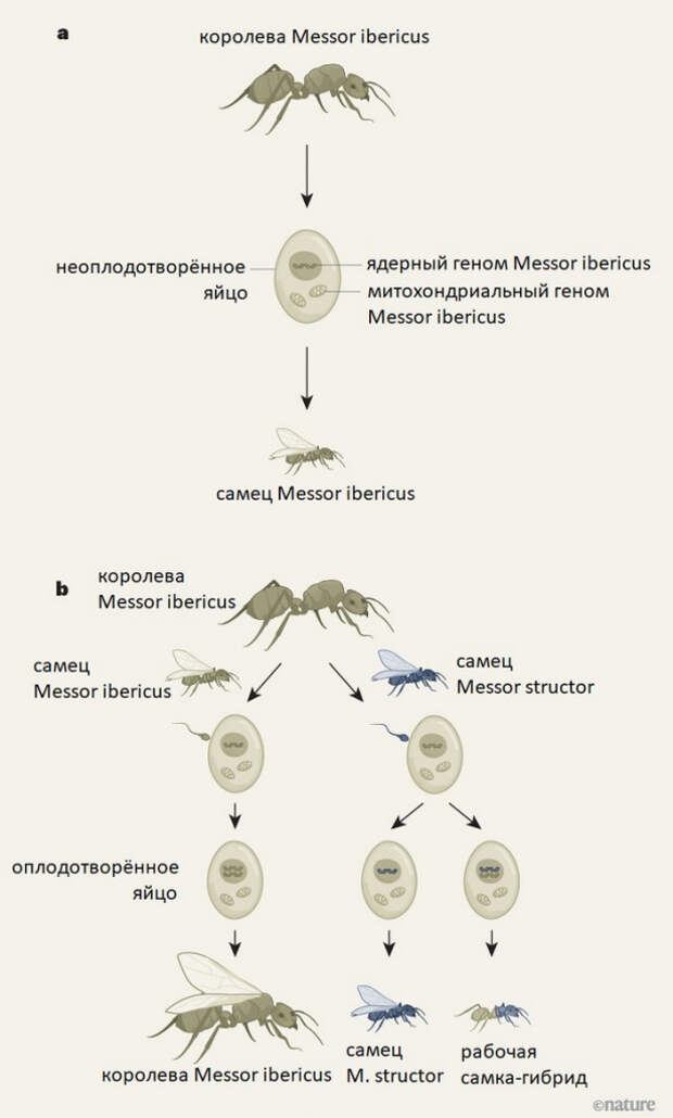 Вверху – из неоплодотворённых яиц королевы M. ibericus путём партеногенеза выводятся гаплоидные самцы того же вида. Внизу – из яиц королевы M. ibericus, оплодотворённых самцом M. ibericus, выводятся диплоидные королевы M. ibericus. Из яиц, оплодотворённых самцом M. structor, выводятся диплоидные рабочие самки-гибриды или гаплоидные самцы M. structor, если в оплодотворённом яйце исчезла материнская половина генома. (Иллюстрация Nature).
